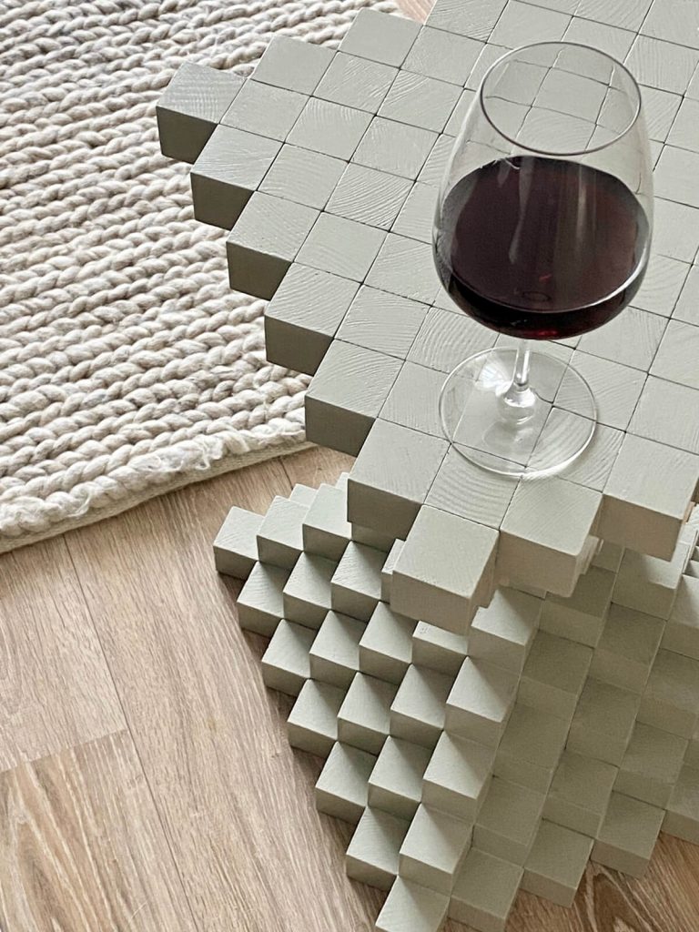 De vormtaal is opgebouwd rond een bijna archaïsche logica van piramidale sequenties. Vanuit een verfijnd, slanker middendeel ontvouwt zich zowel naar boven als naar beneden een identieke, getrapte opbouw. Deze symmetrie creëert een stille verticaliteit, waarin de tafel zich niet presenteert als object met begin of einde, maar als een continue beweging in twee richtingen.